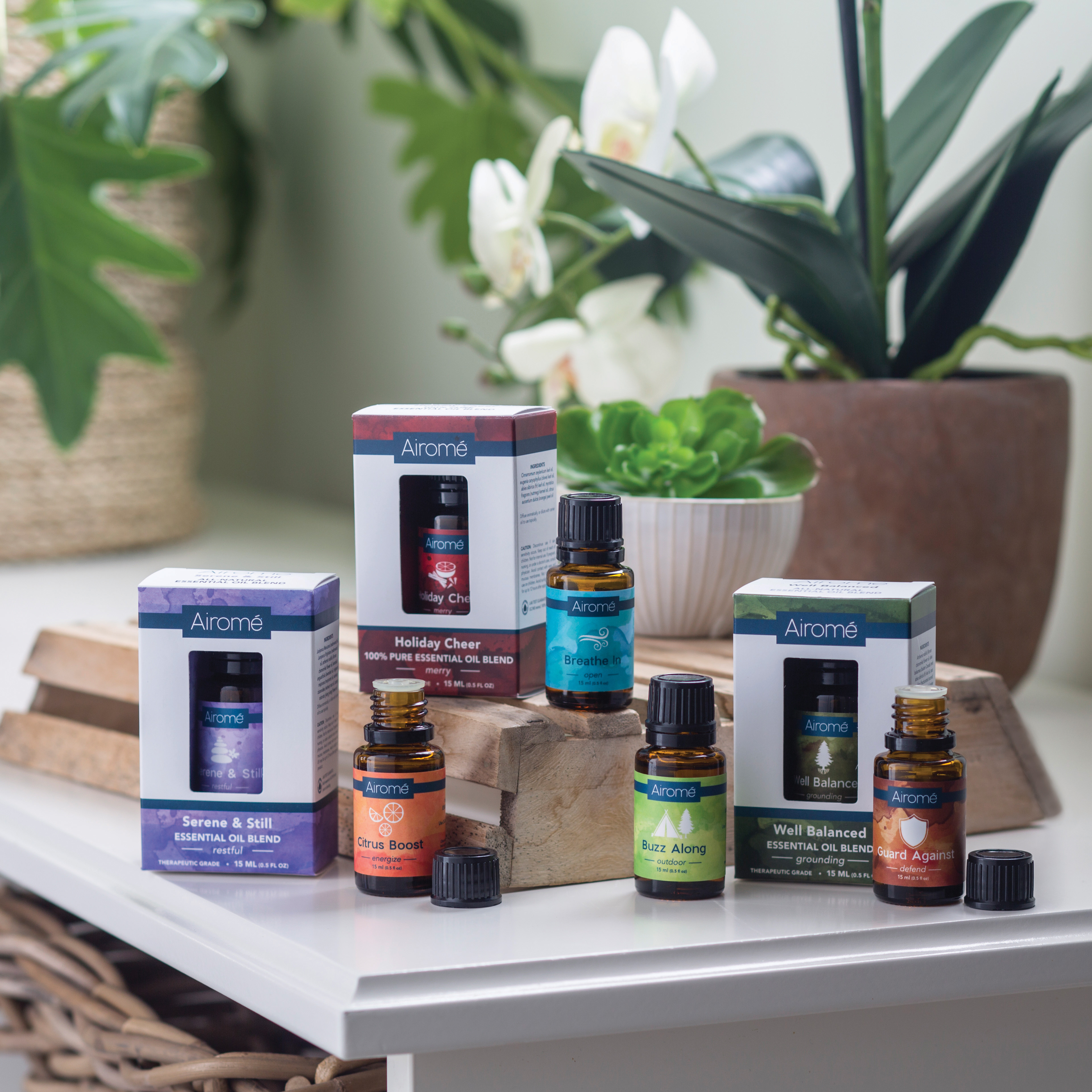 Airome Essential Oil Blends are crafted by our aromatherapy experts using 100% pure, therapeutic grade essential oils. Each blend is especifically designed to combine essential oils with complementary profiles which blend prefectly together to maximize aromatherapy benefits. Essential Oil Blends can be enjoyed aromatically with a diffuser or applied topically when diluted with Airome Fractionated Coconut Oil.